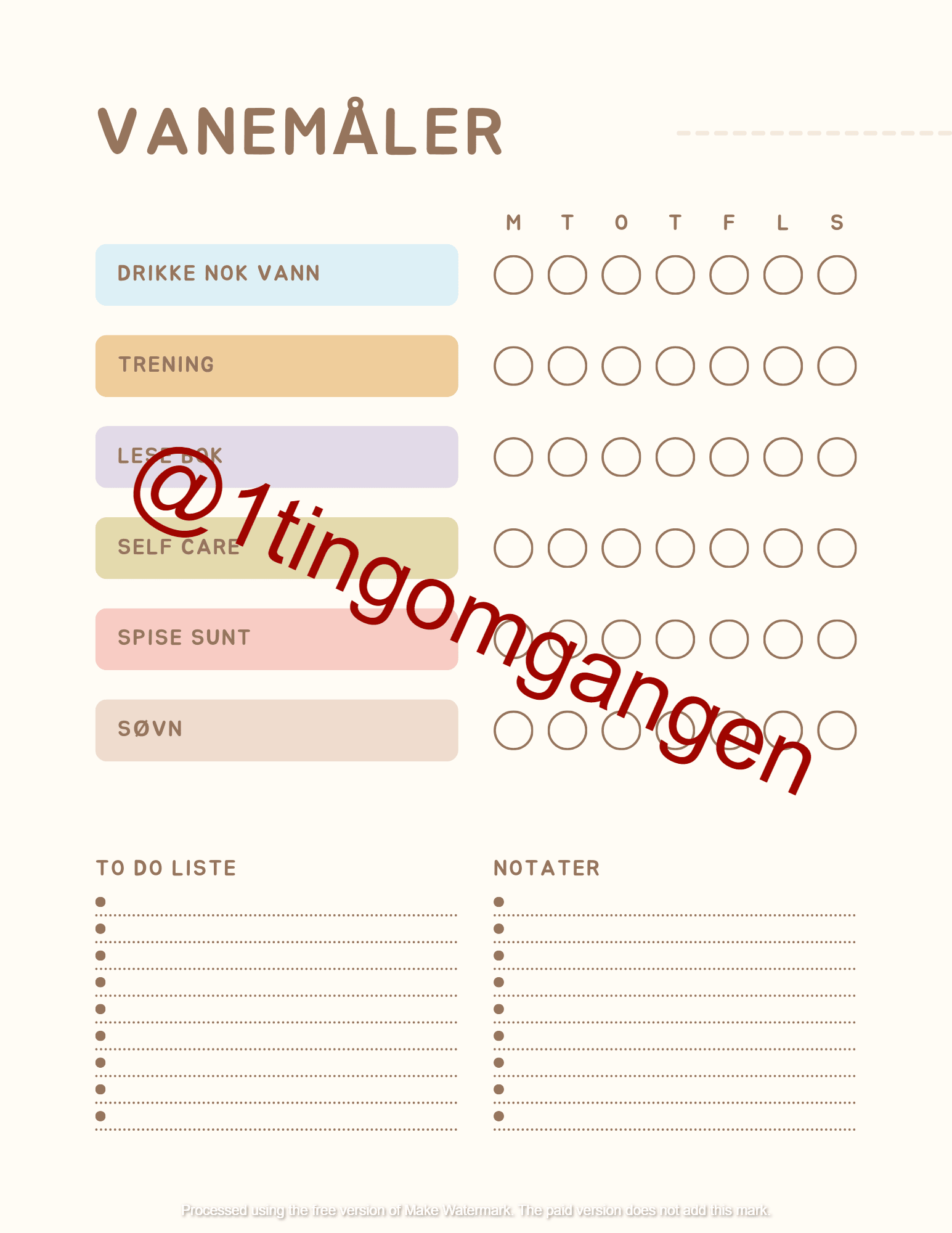 Løsningen for å hjelpe deg med å holde oversikt over vanene dine, enten det er i arbeid eller privatliv. Dette brukervennlige verktøyet gir deg muligheten til å enkelt opprette, spore og analysere daglige, ukentlige eller månedlige rutiner. Med et klart og intuitivt grensesnitt får du en visuell oversikt over fremgangen din, noe som motiverer deg til å holde deg på rett spor og nå dine mål raskere. Print ut og bruk.